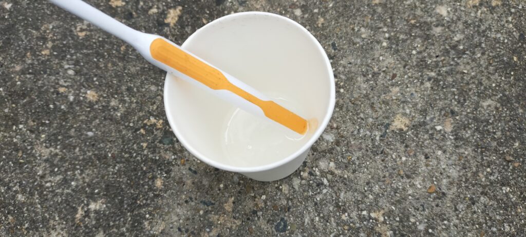 付属のカップで軽量して、紙コップにいれて使い古しの歯ブラシを使って混ぜます。