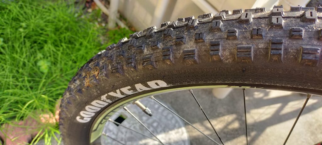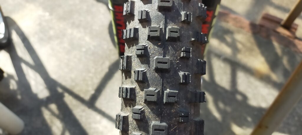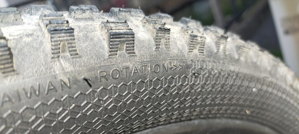 トレッドのパターンは、キャラメル型の高さのあるノブがならぶ、ど定番のブロックパターンです。